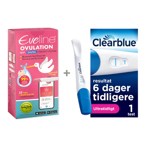 Til deg som ønsker digital presisjon under eggløsningen og mulighet for å teste for graviditet så tidlig som mulig. Denne pakken kombinerer Evelines smarte fertilitetssystem med Clearblues pålitelige og høyfølsomme graviditetstest.