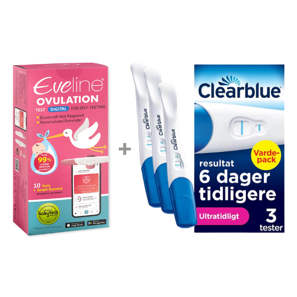 - I alt 10 eggløsningsteststrips og 5 graviditetstester — 3 Clearblue Ultratidlig + 2 Babyplan graviditetstest stav (medfølger Eveline)